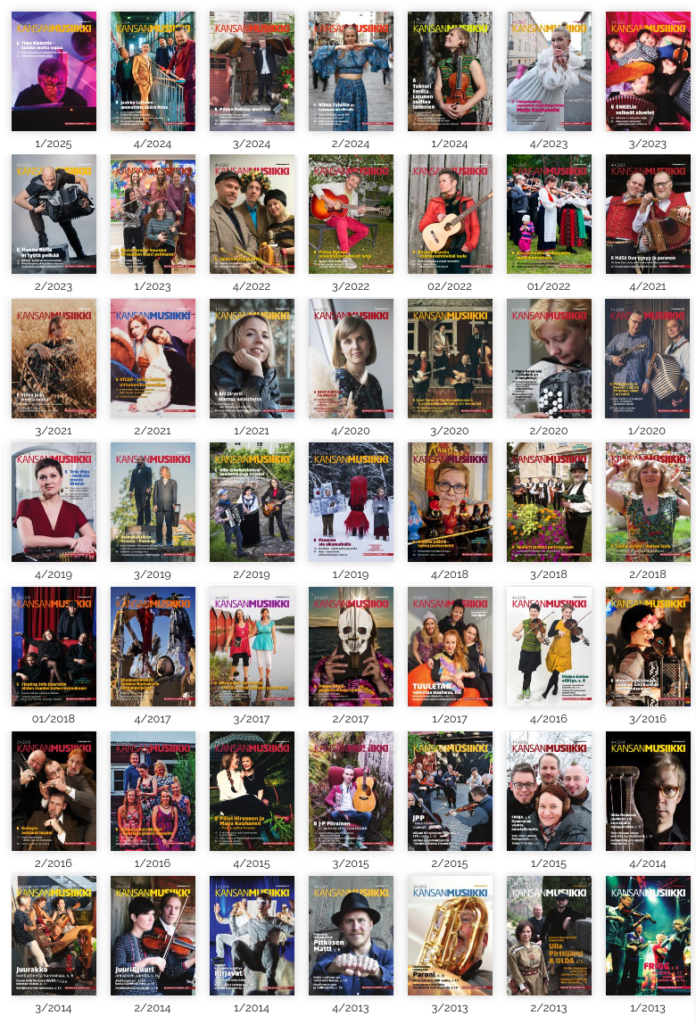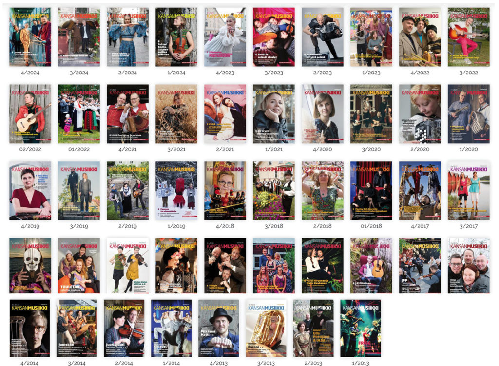 Linkin takana on pitkästi yli kymmenen vuoden Kansanmusiikki-lehden ja sitä edeltäneen Pelimanni-lehden sisällöt. Sisällysluetteloista on lisäksi poimittu erikseen Ajassa-sivun yhtyeet ja taiteilijat, kolumnistit sekä Taustapeili-artikkelisarjan henkilöt. Dokumentista on etsi-apuvälineellä helppo löytää, onko jostain tietystä henkilöstä tai yhtyeestä ollut lehdissä vuosien varrella juttuja. Kaikki vuoden 2013 jälkeen ilmestyneet Kansanmusiikki-lehdet löytyvät verkosta osoitteesta lehtiluukku.fi ja Pelimanni-lehtien artikkeleita voi tiedustella toimituksesta lehti@kansanmusiikkiliitto.fi. Toimitamme niitä mahdollisuuksien mukaan vaikka pdf:nä. Jonkin verran paperilehtiäkin on saatavilla toimituskuluja vastaan.